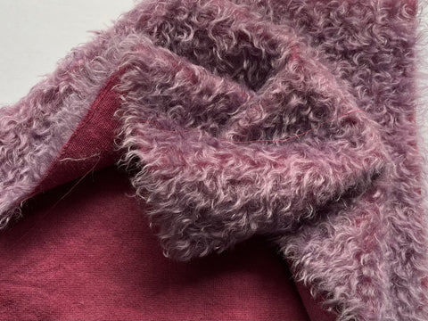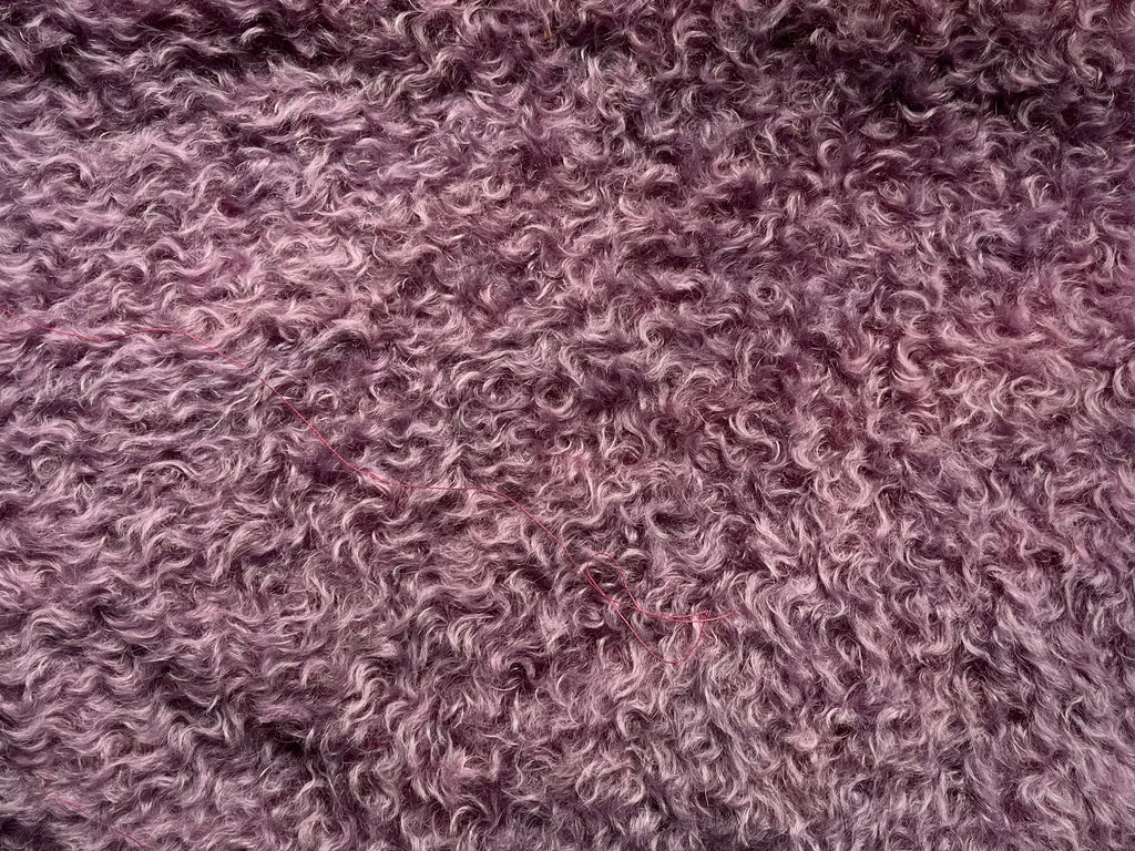 Hand Dyed medium dense curled 25mm mohair - Heather Mauve with a wine coloured backing. Mohair is a lighter colour than the picture shows, sorry, a difficult one to photograph