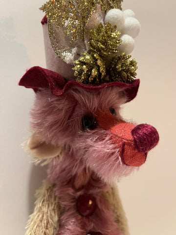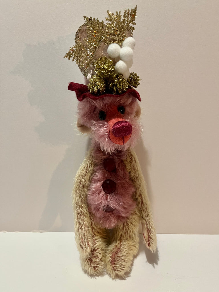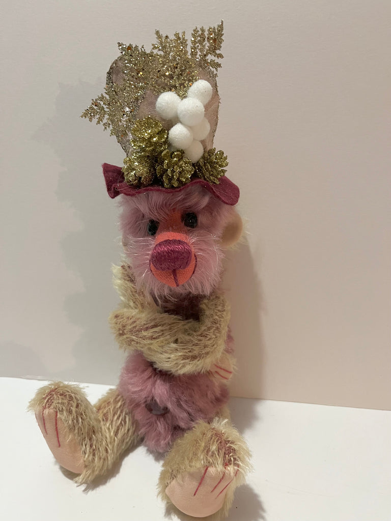 Brianna is a 5 way nut & bolt jointed Artist bear, this will help to pose the bear better as shown in the pictures. Made from a mixture of hand dyed mohair and a short pile mohair with faux cashmere paw pads. Brianna has been stuffed with polyester filling and a small amount of steel shot to give added weight. The arms are partly filled with steel shot which makes them floppy to pose, the eyes are a lovely shiny amethyst colour and the nose is hand embroidered in a matching perle thread. Brianna wears an attached decorated hat (not removable) A fun bear to make you smile :) Stands at approximately 13"/33cm tall to include hat.