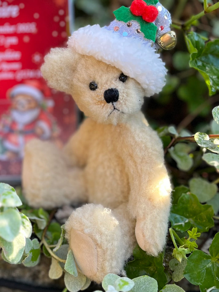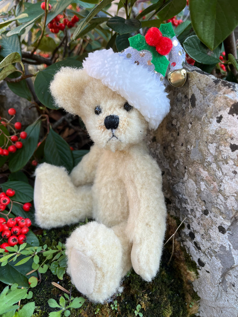 This bear is a 5 way cotter pin jointed bear. I have made this bear from a lovely sheeps wool complimented with matching cashmere paw pads. Stuffed with polyester filling, black coloured glass shiny eyes and a hand embroidered black perle nose. All hand sewn and wearing a removeable Christmas hat.