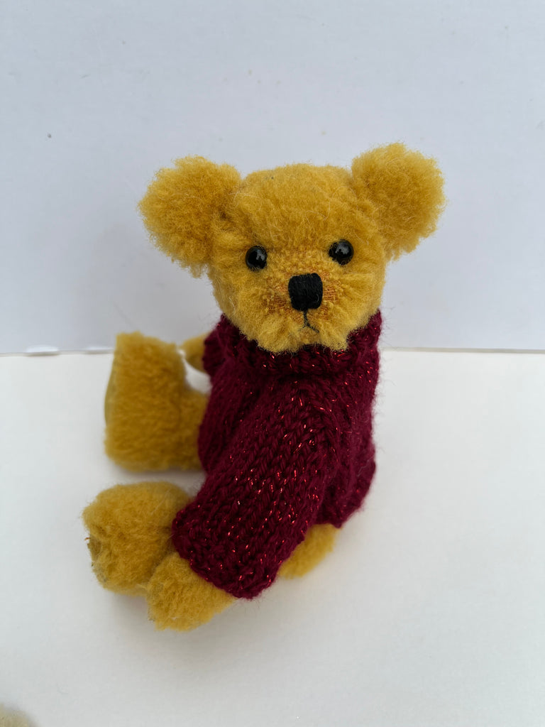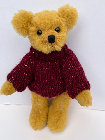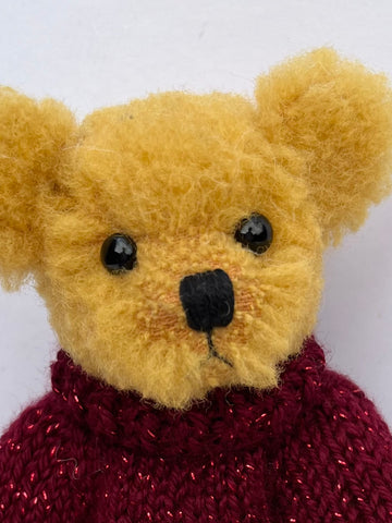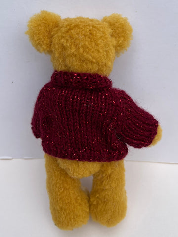 This bear is a 5 way cotter pin jointed bear. I have made this bear from a lovely dark golden sheeps wool complimented with matching gold cashmere paw pads. Stuffed with polyester filling, black coloured glass shiny eyes and a hand embroidered black perle nose. All hand sewn and wearing a hand knitted jumper in a double knit deep burgundy colour with a bit of glitz.
