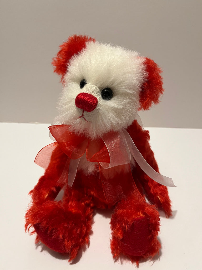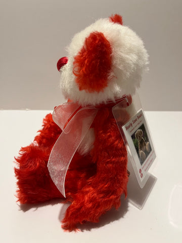 This bear is a 5 way nut and bolt jointed bear, this helps to pose the bear better as shown in the pictures. I have made this bear from a lovely white alpaca fabric and red mohair. Complimented with matching ultra suede red paw pads. Stuffed with polyester filling and a small amount of steel balls filling to add a bit of extra weight. Joyce has shiny black coloured glass shiny eyes and a hand embroidered coloured perle nose in red. Joyce wears red and white ribbons around her neck.