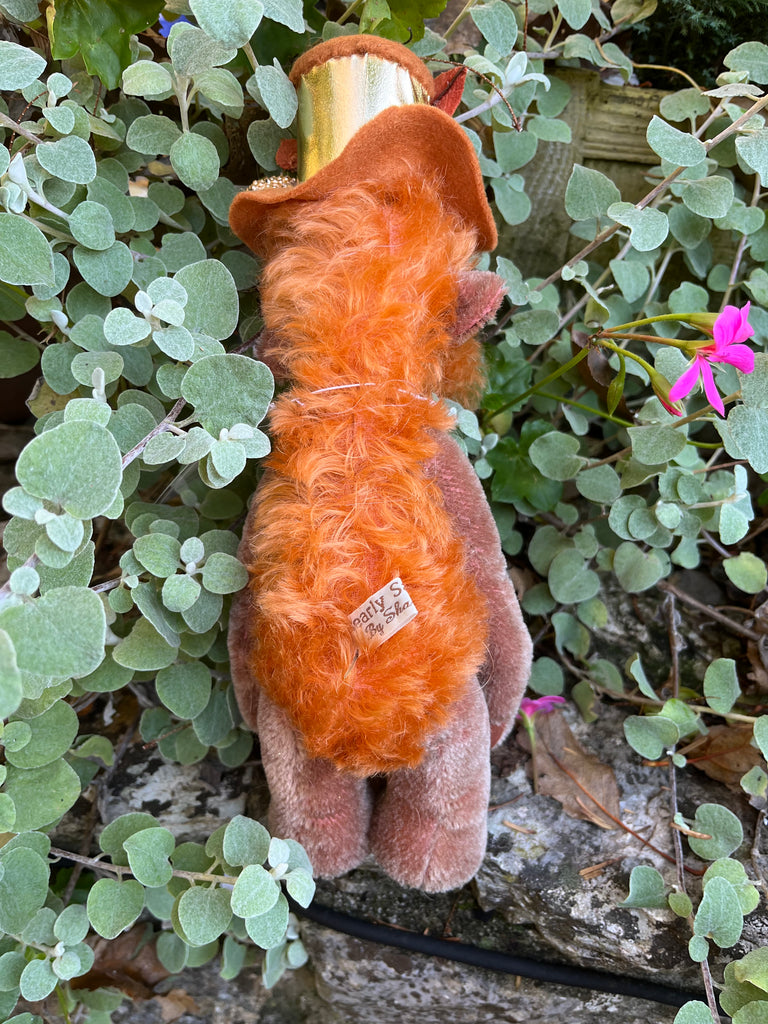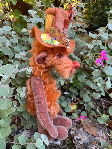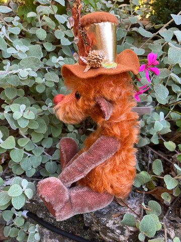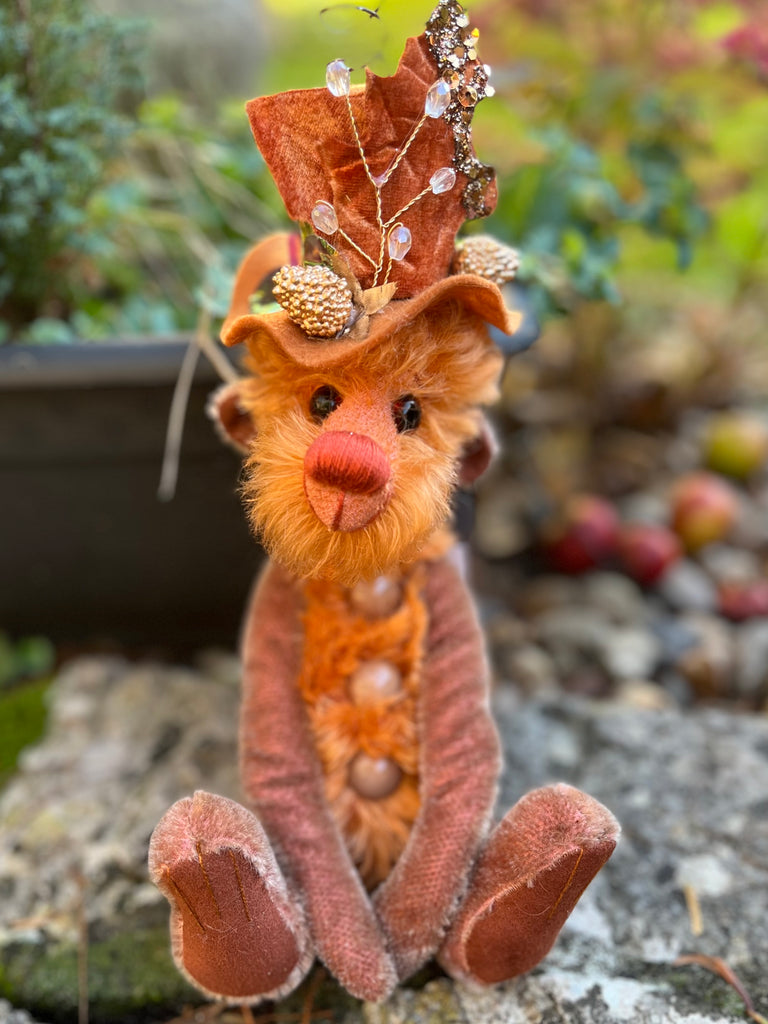 Umber is a 5 way nut & bolt jointed Artist bear, this will help to pose the bear better as shown in the pictures. Made from a mixture of hand dyed mohair's with ultra suede paw pads. Umber has been stuffed with polyester filling and a small amount of steel shot to give added weight. The arms are partly filled with steel shot which makes them floppy to pose, the eyes are a lovely shiny deep brown colour and the nose is hand embroidered in a matching perle thread. Umber wears an attached decorated hat (not removable) A fun bear to make you smile :) Stands at approximately 13"/33cm tall to include hat.