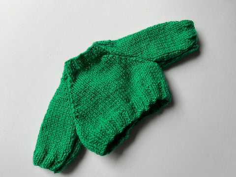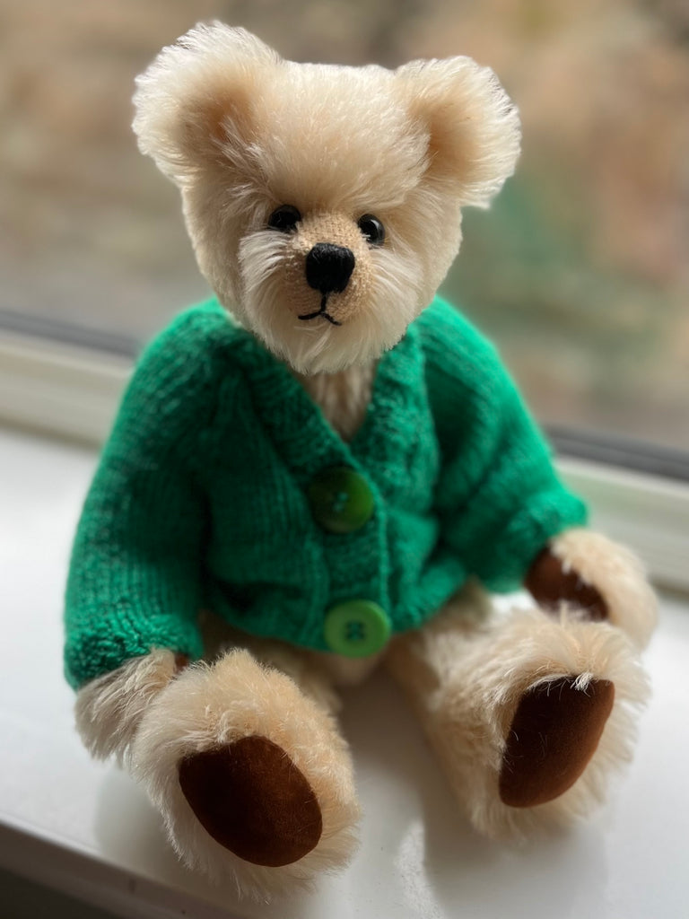 Hand made knitted cardigan. it does have a bit of stretch, as you are well aware the bears come in all shapes and sizes!  Knitted in a lovely green coloured wool.  Measurements are approximately chest 10"/25cm, (so 10"/25cm all the way around bears chest & back) sleeve length from shoulder 5"/13cm, jumper length from collar 5"/13cm