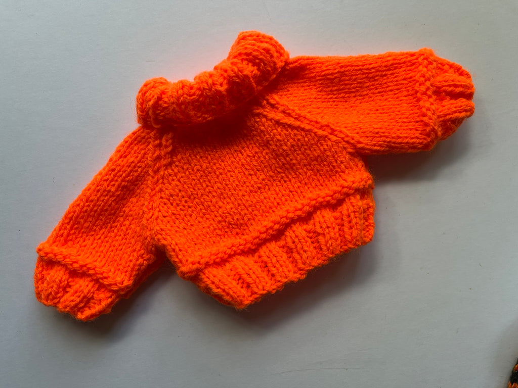 Handmade knitted jumper made by myself in my own design.  I have knitted it in a double knit orange wool. The neck is round, has no fastenings and is easy to pull over a bears head, can be worn either way. Measurements are approx: chest 10"/26cm, (the measurement all the way around bears chest is 10"/26cm approximately), sleeve length from shoulder 5"/13cm, jumper length from neck 4"/10cm