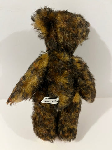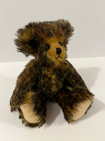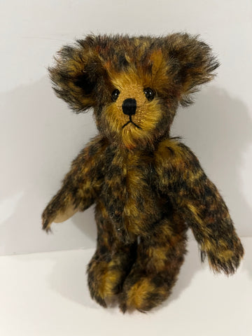 This bear is a 5 way cotter pin jointed bear, this helps to pose the bear better as shown in the picture. I have made this bear from a lovely tipped mohair complimented with faux cashmere paw pads. Stuffed with polyester filling and black coloured glass eyes and a hand embroidered black perle nose.