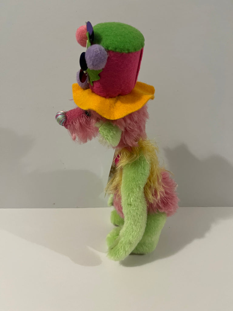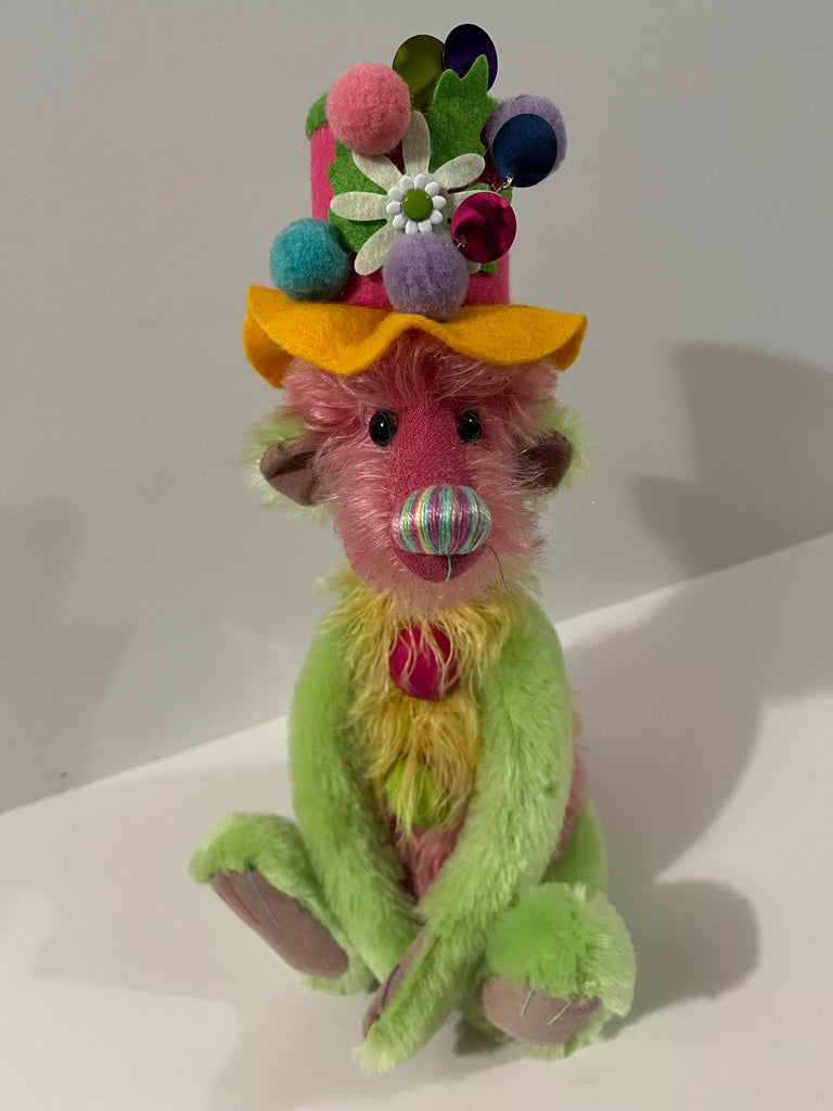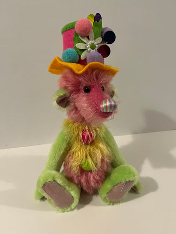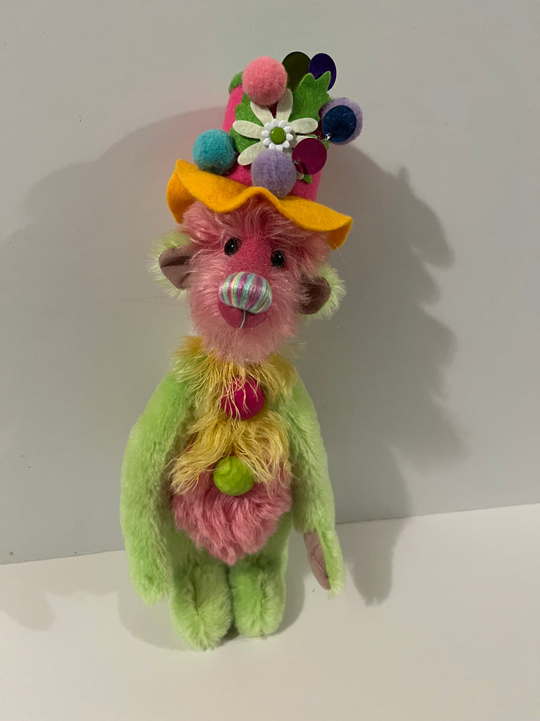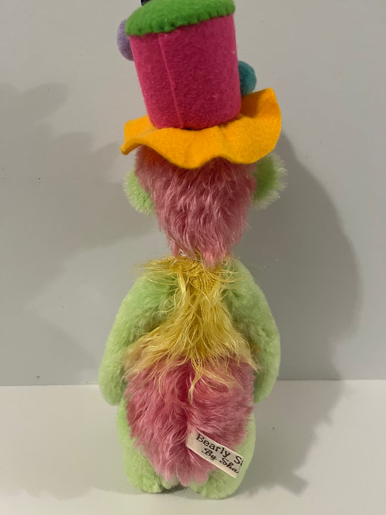 Tango is a 5 way nut & bolt jointed Artist bear, this will help to pose the bear better as shown in the pictures. Made from a mixture of hand dyed mohair's with faux cashmere paw pads. Tango has been stuffed with polyester filling and a small amount of steel shot to give added weight. The arms are partly filled with steel shot which makes them floppy to pose, the eyes are a lovely shiny amethyst colour and the nose is hand embroidered in a variegated thread. Tango wears an attached decorated hat (not removable)  A fun bear to make you smile :) Stands at approximately 13"/33cm tall to include hat.