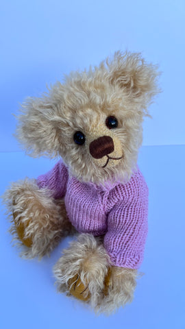 This bear is a 5 way nut and bolt jointed bear, this helps to pose the bear better as shown in the pictures. I have made this bear from a lovely wavy mohair. Complimented with matching ultra suede paw pads. Stuffed with polyester filling and a small amount of steel balls filling to add a bit of extra weight. Valaree has dark brown coloured glass shiny eyes and a hand embroidered coloured perle nose. I have hand knitted a jumper for Valaree, so chilly out there!