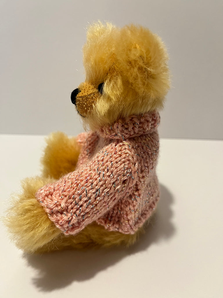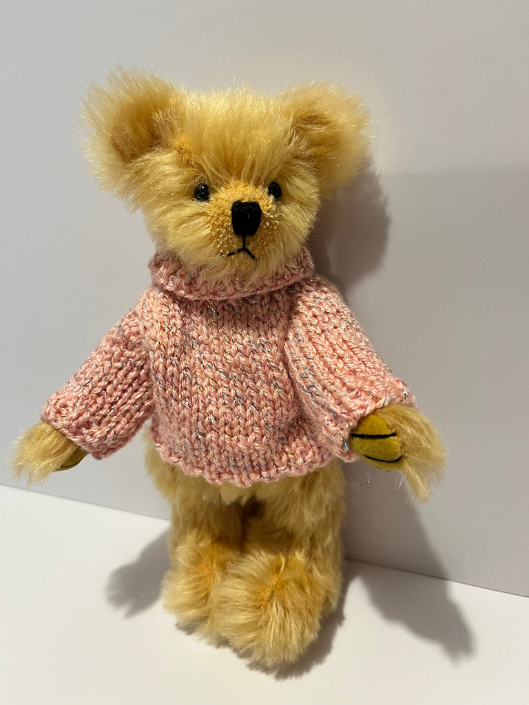 This bear is a 5 way cotter pin jointed bear. I have made this bear from a lovely golden coloured mohair complimented with matching faux cashmere paw pads. Stuffed with polyester filling, black coloured glass shiny eyes and a hand embroidered black perle nose. All hand sewn and wearing a removeable hand made jumper in a double knit wool with a bit of glitz.